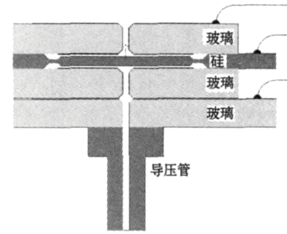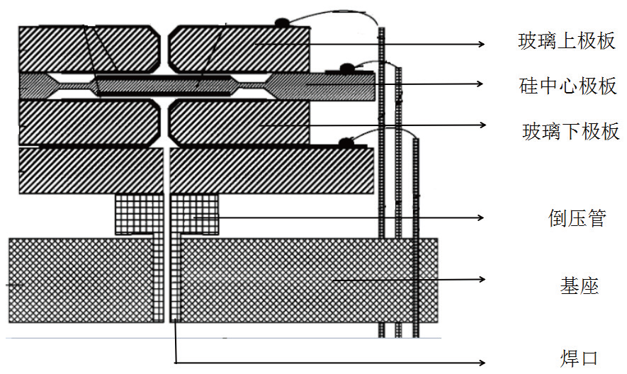 两端的玻璃板起固定和电极引出的作用。玻璃板中央有一个压力孔。压力通过压力孔加载到硅中心板上,引起两侧电容的变化。差压测量是通过检测电容的变化来实现的。为了便于固定在压力座上,极板的另一侧通过金属导管实现芯片的差压加载。整个硅电容差压芯体的结构如图1 所示。为了确保准确控制板间隙,实现无蠕变硬封连接,静电封接工艺是最佳选择。